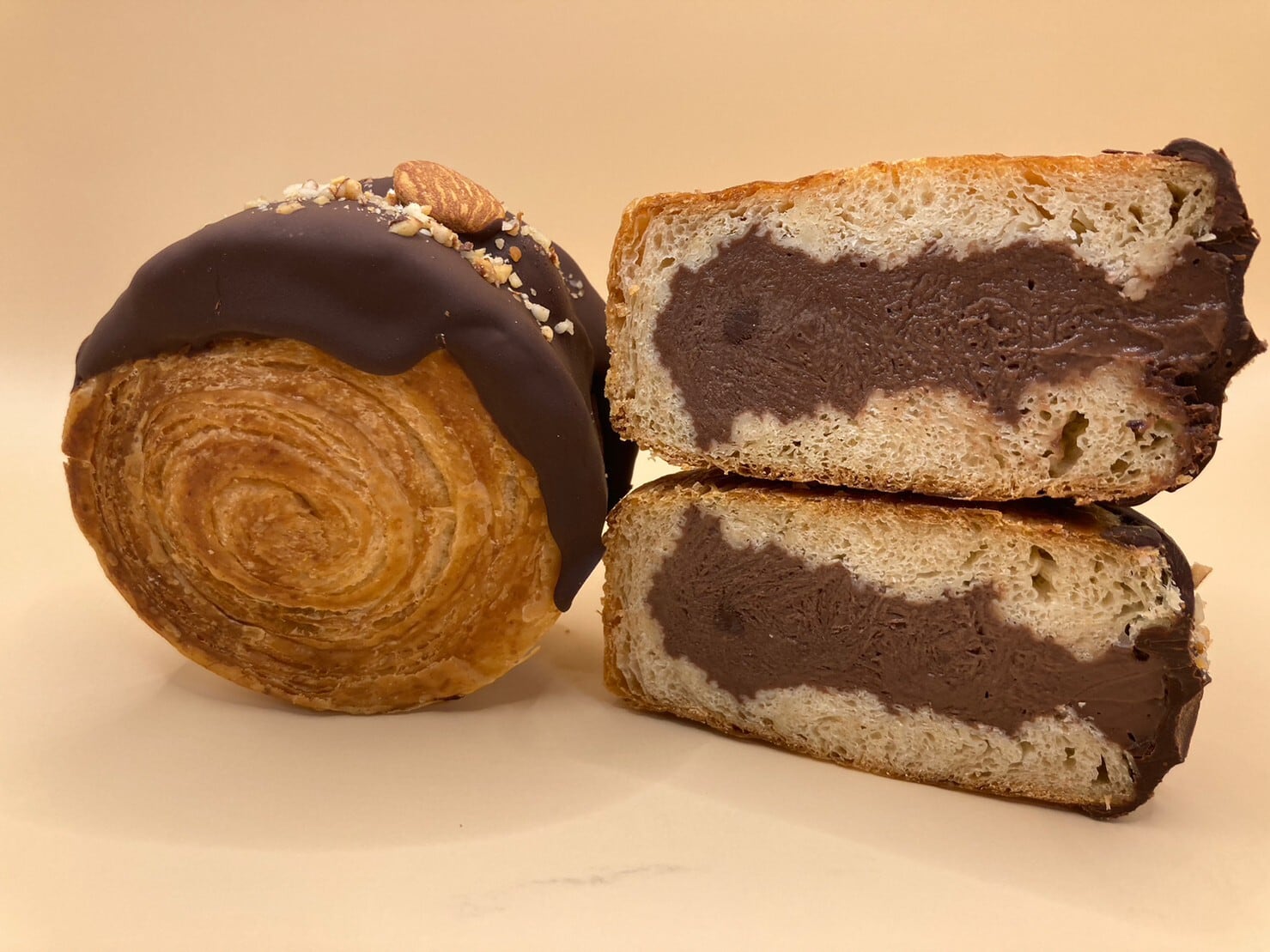 スペルト小麦(古代小麦)のクロワッサン生地をロール状に焼き上げた、チョコクロワッサンロール。